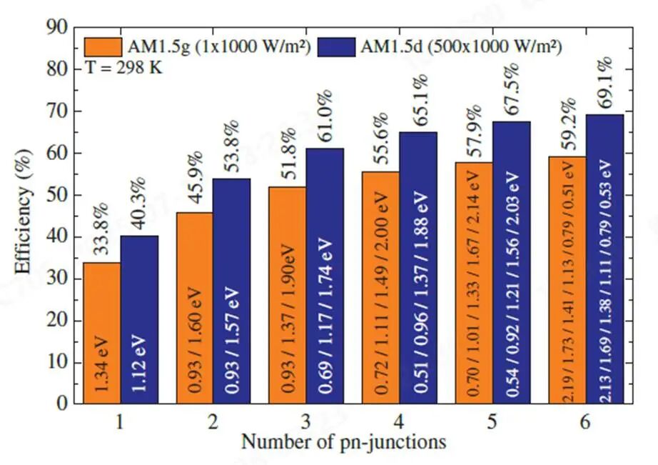 图3. 在AM1.5g(1×1000W/m2)和500倍聚光AM1.5d(500×1000W/m2)条件下不同pn结(子电池)数量的理论效率极限[1]