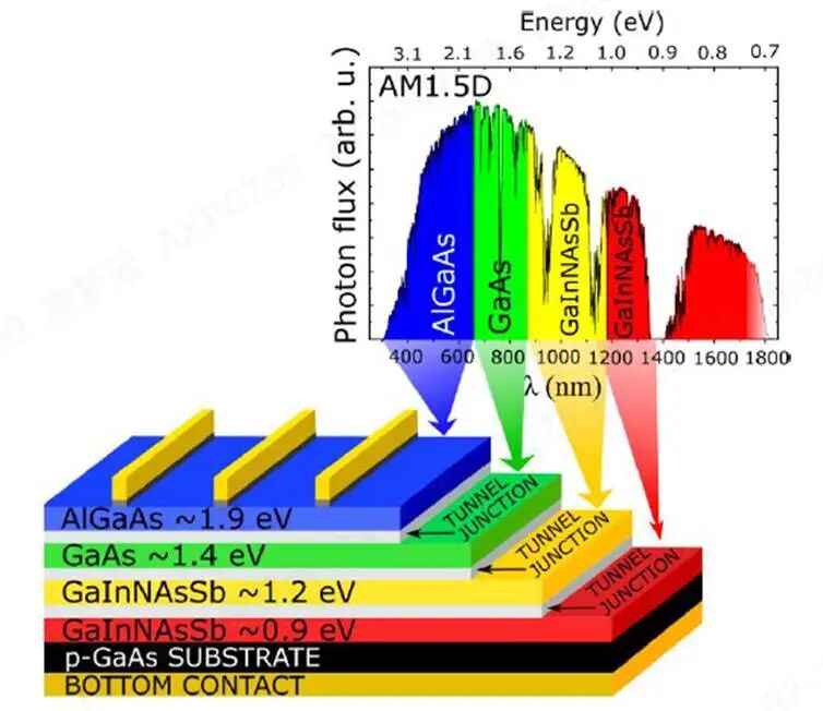 图1. 具有1.9 eV、1.4 eV、1.2 eV和0.9 eV结的4J叠层电池的示意图结构。1.2eV和0.9eV pn结基于GalnNAsSb[5]。