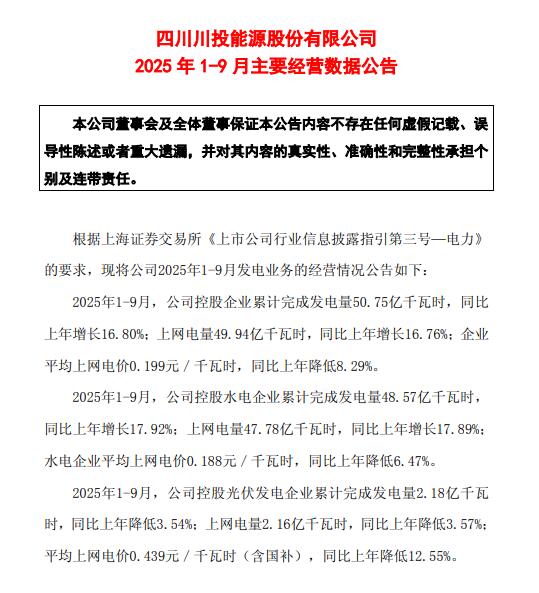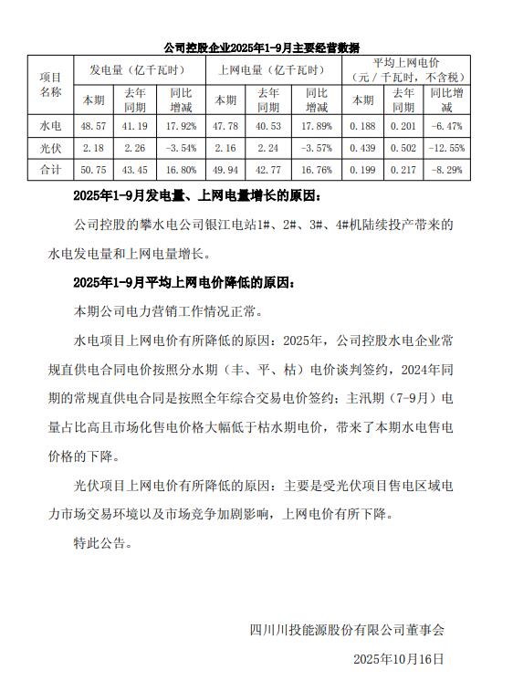 10月16日,川投能源发布四川川投能源股份有限公司2025年1-9月主要经营数据公告。