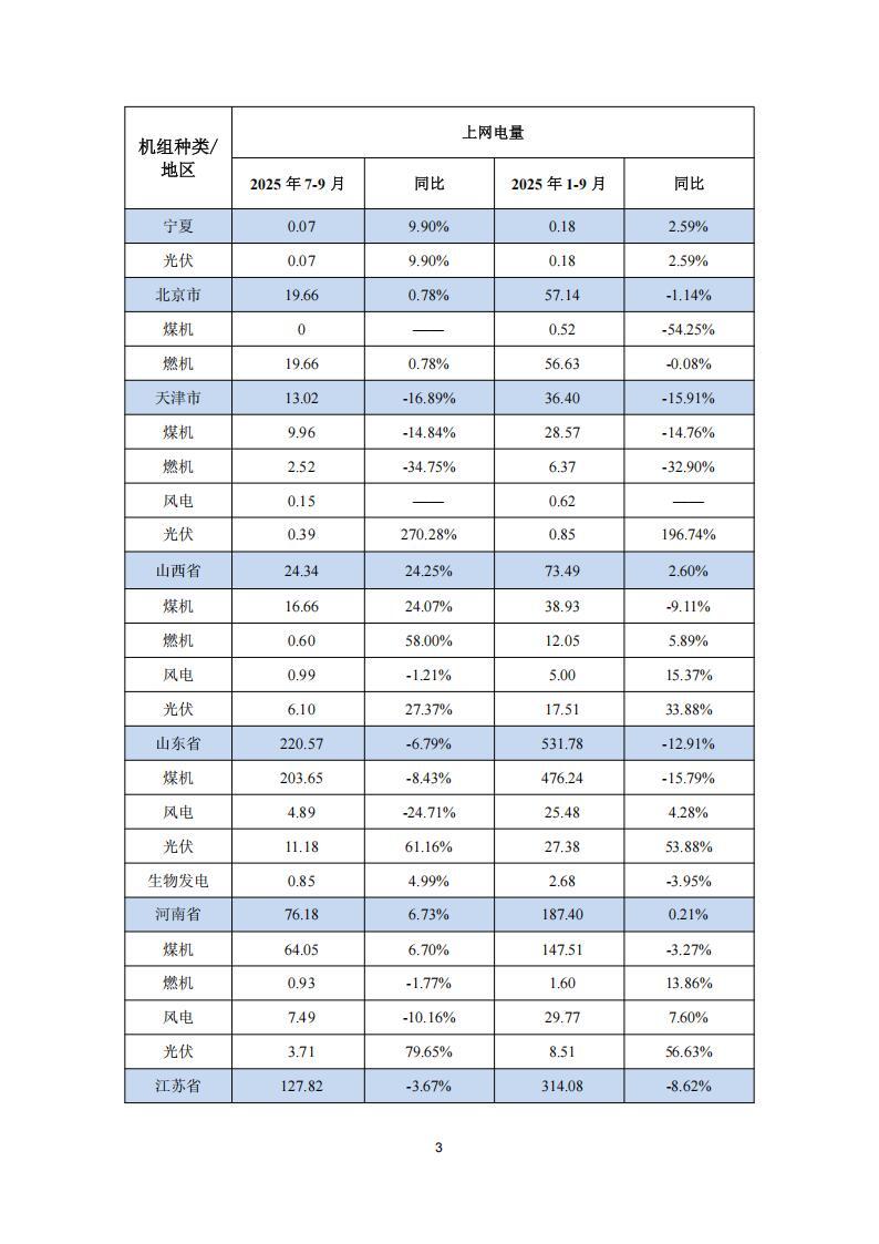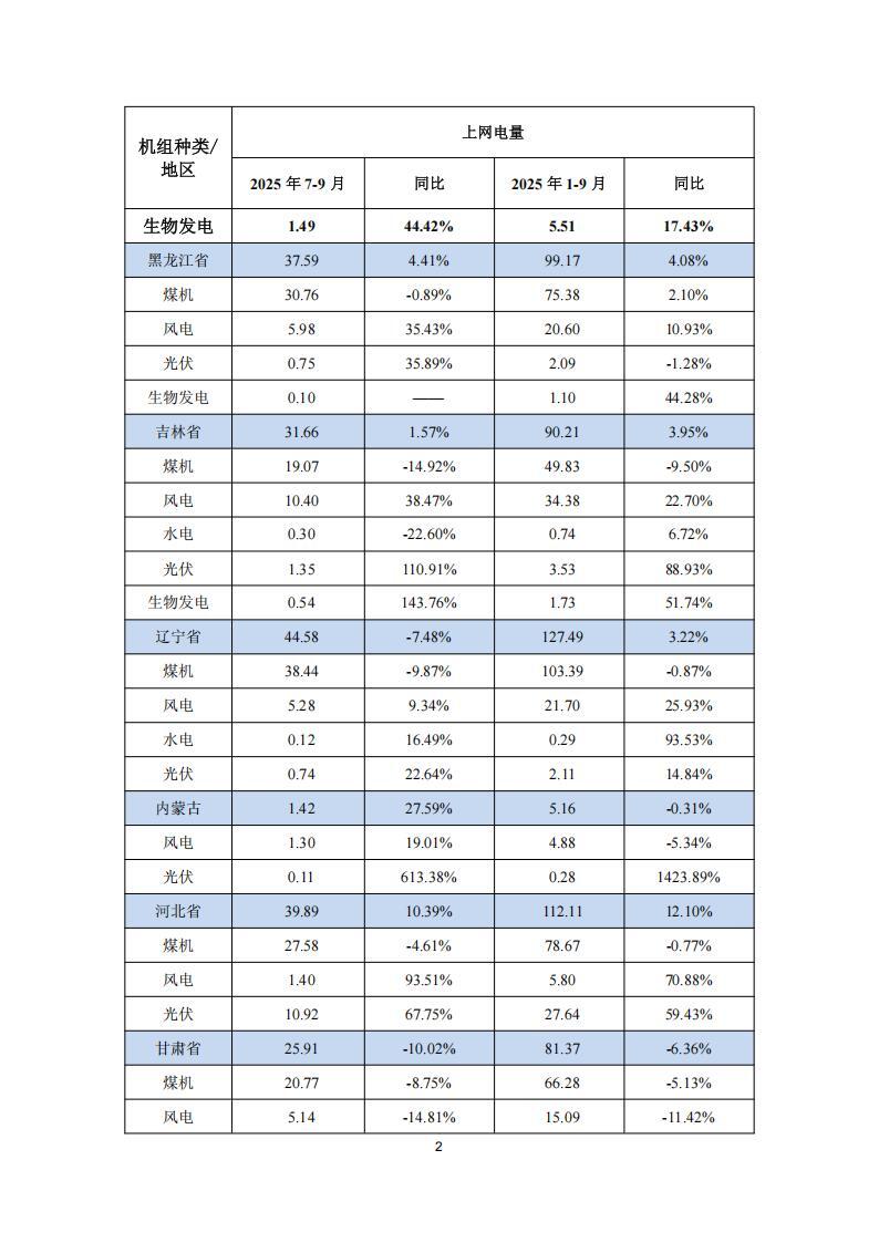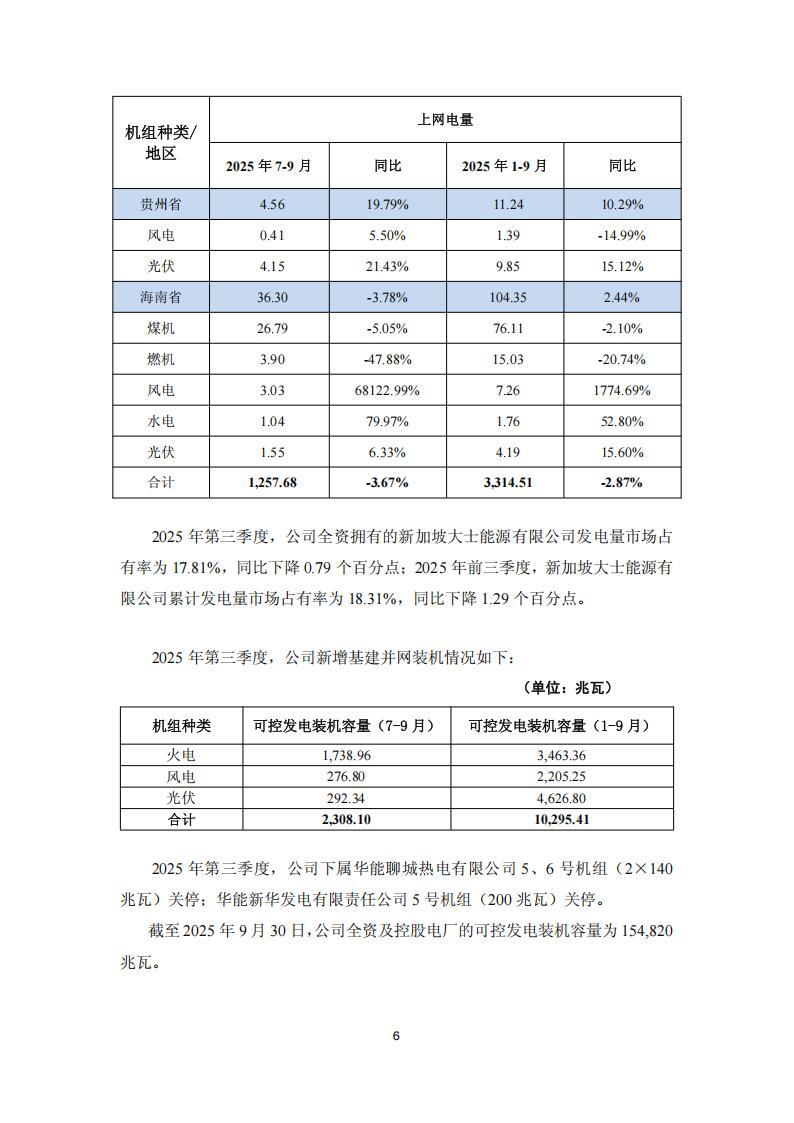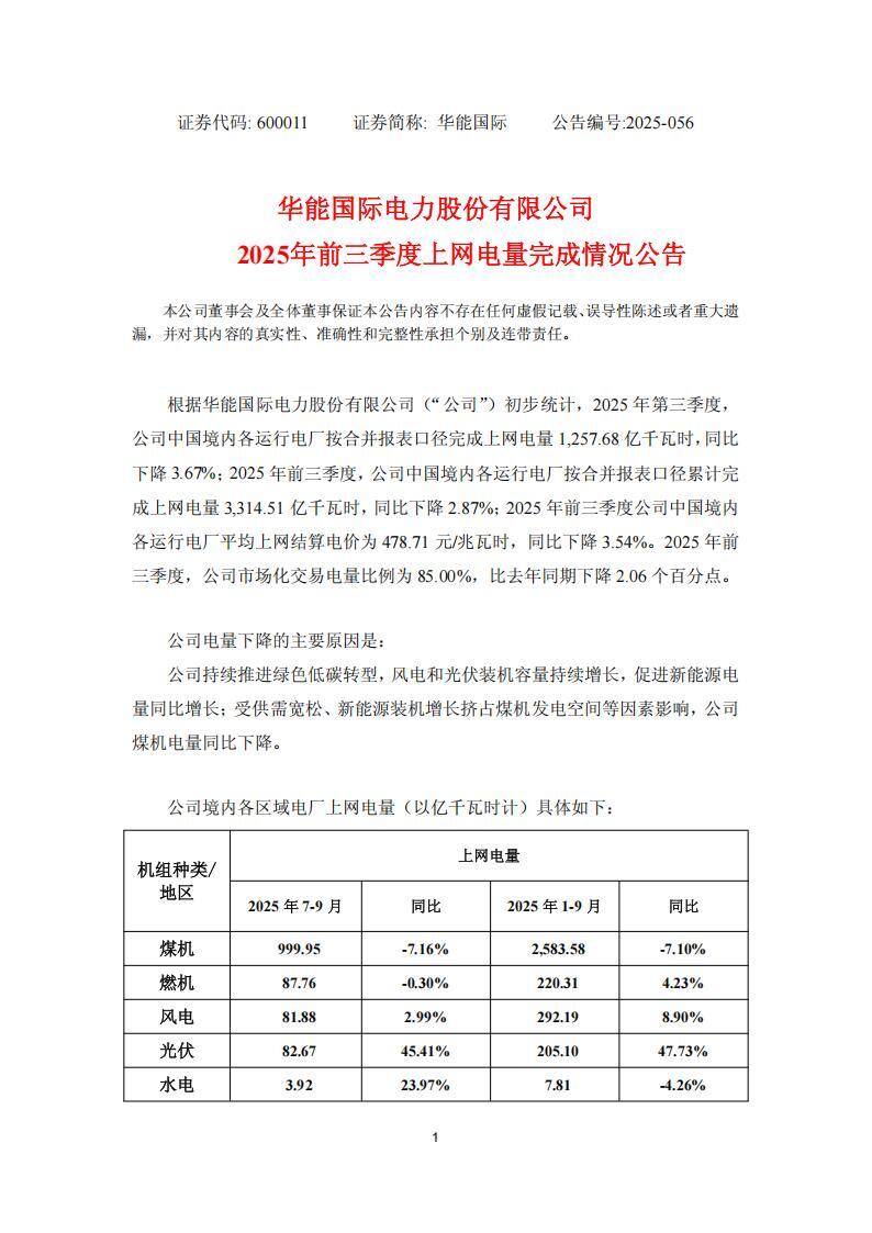 公告显示,2025 年前三季度,华能国中国境内各运行电厂按合并报表口径累计完成上网电量 3,314.51 亿千瓦时,同比下降 2.87%;