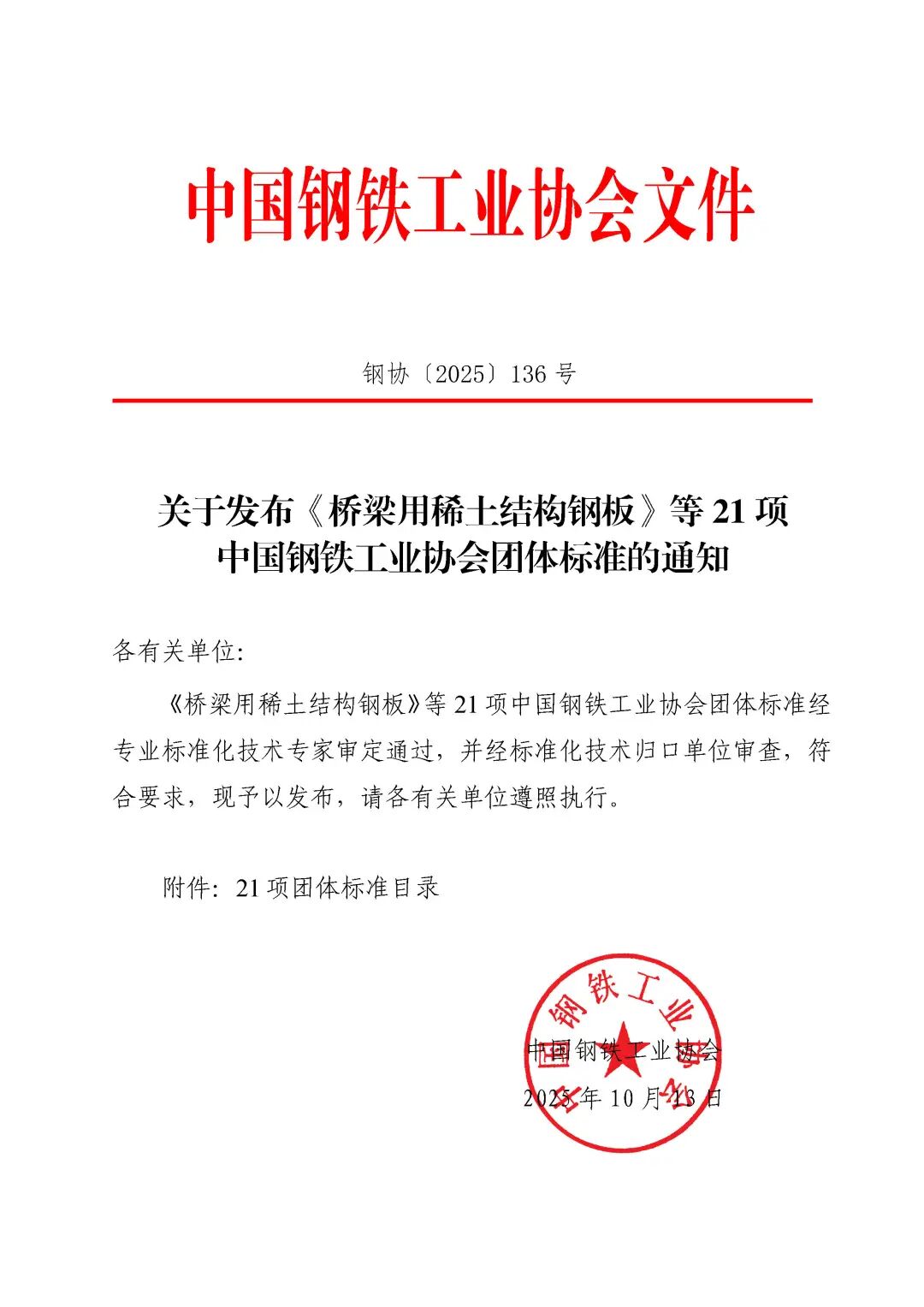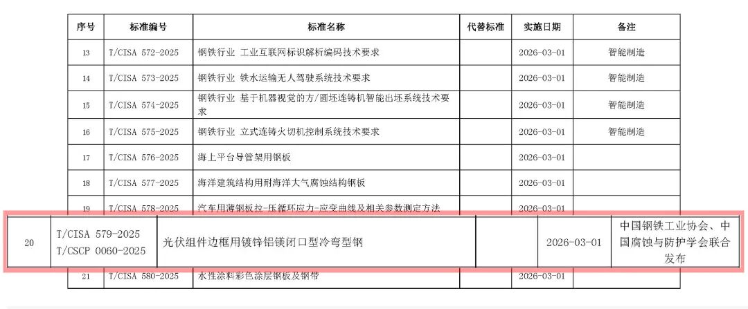 10月13日,中国钢铁工业协会正式发布包括《桥梁用稀土结构钢板》在内的21项团体标准。其中,《光伏组件边框用镀锌铝镁闭口型冷弯型钢》标准尤为引人注目,该标准由中国钢铁工业协会与中国腐蚀与防护学会联合发布,并并由光伏钢边框行业领先企业惠汕牵头制定,将于2026年3月起正式实施,为行业高质量发展提供了明确的规范指引。