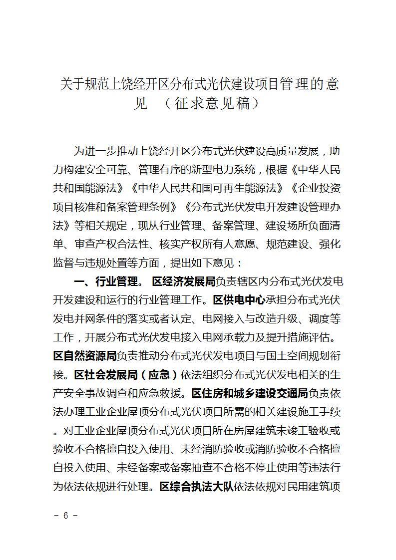 为进一步推动上饶经开区分布式光伏建设高质量发展,助力构建安全可靠、管理有序的新型电力系统,上饶经济技术开发区经济发展局起草了《关于规范上饶经开区分布式光伏建设项目管理的意见 (征求意见稿)》,现向社会各界征求意见。