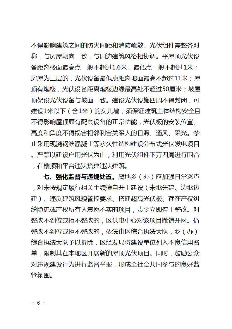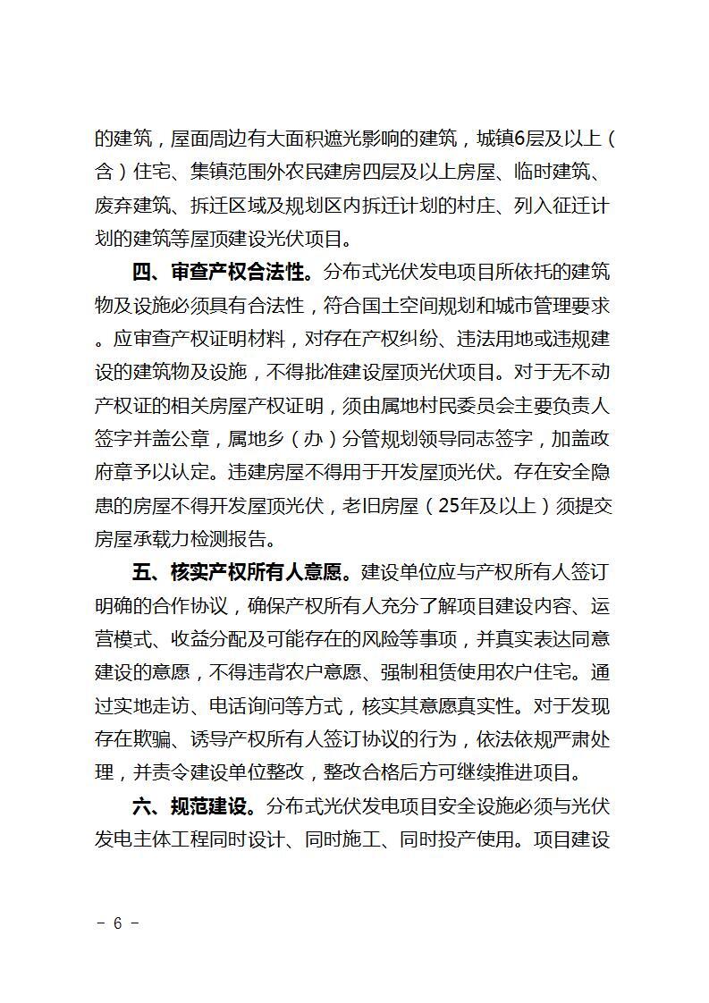 严禁:在风景名胜区、文物保护单位、传统村落、湿地公园、历史建筑范围内,在铁路、高速公路、国省道、城市、集镇主干道沿线两边50米范围内,屋面或周边存在大量粉尘、火灾危险性分类为甲类、乙类和腐蚀气体的建筑,屋面周边有大面积遮光影响的建筑,城镇6层及以上(含)住宅、集镇范围外农民建房四层及以上房屋、临时建筑、废弃建筑、拆迁区域及规划区内拆迁计划的村庄、列入征迁计划的建筑等屋顶建设光伏项目。