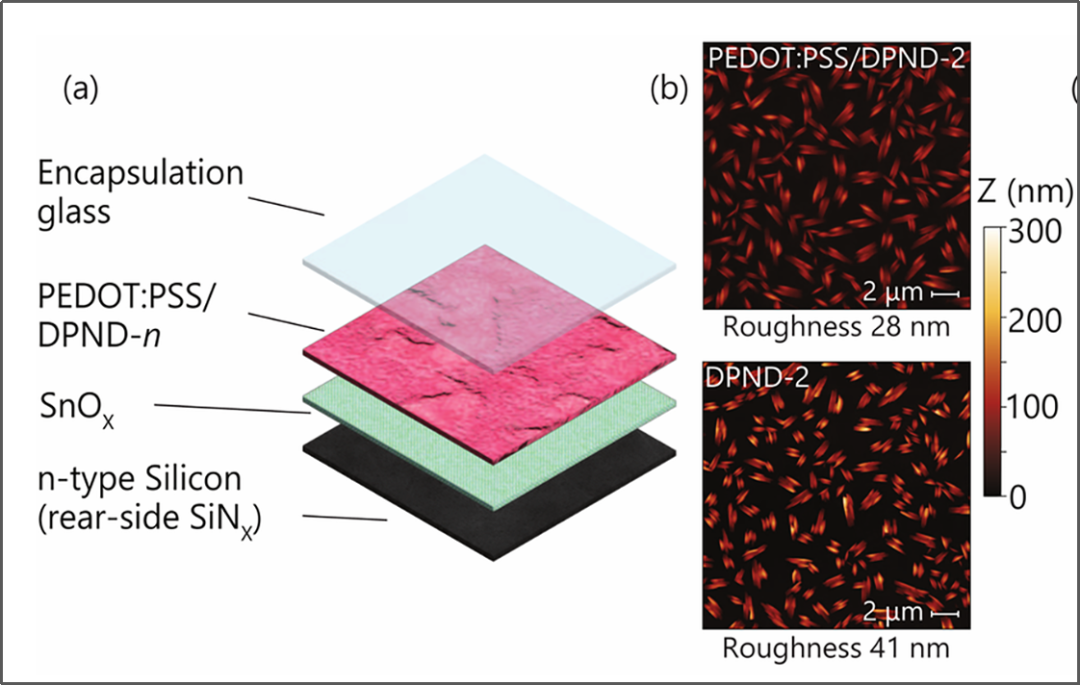 但传统单线态分裂材料(如并四苯)存在单线态裂变量子产率低、光化学稳定性差的问题,因此,研发新型高效稳定的单线态分裂材料成为SFOS电池突破的关键所在。UNSW团队成功研发的二吡咯并萘啶二酮(DPND)薄膜与SnO?/PEDOT:PSS双层钝化结构结合,解决了材料稳定性和界面钝化两大关键问题。DPND具有高的稳定性,与硅具有良好的能带匹配,量子产率超过170%,能够实现单线态分裂产生的多激子向硅基衬底的高效转移。