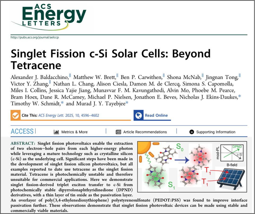 2025 年 10 月,一道新能与澳大利亚新南威尔士大学(UNSW)光伏研究中心联合研究效率可达40%高效电池项目--基于单线态分裂的多光子高效太阳电池(Singlet Fission on Silicon,简称SFOS)研究取得关键突破,UNSW团队发现了性能稳定、量子产率高、与硅具有良好能带匹配的新型单线态分裂材料DPND,相关研究成果已发表于国际能源领域顶级学术期刊《ACS Energy Letters》。此次成果的发表标志着多光子 SFOS 高效太阳电池基础研究获得重大突破,为后续在硅上制备高效多光子SFOS 太阳电池产业化奠定了重要基础。