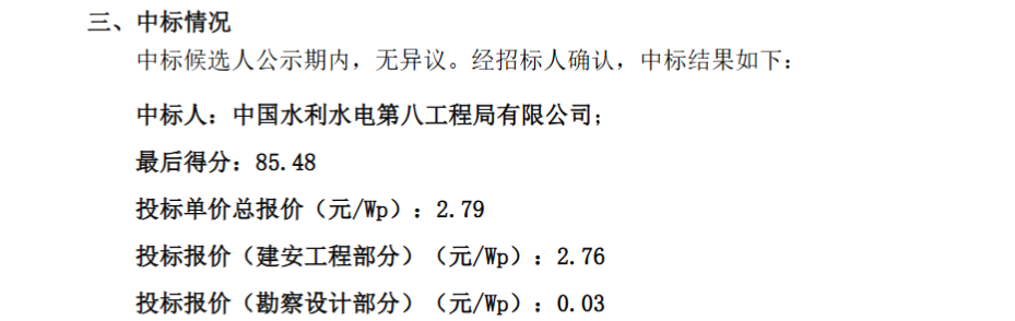 中标人为中国水利水电第八工程局有限公司,投标单价总报价2.79元/Wp,其中投标报价(建安工程部分)2.76元/Wp,投标报价(勘察设计部分)0.03元/Wp。