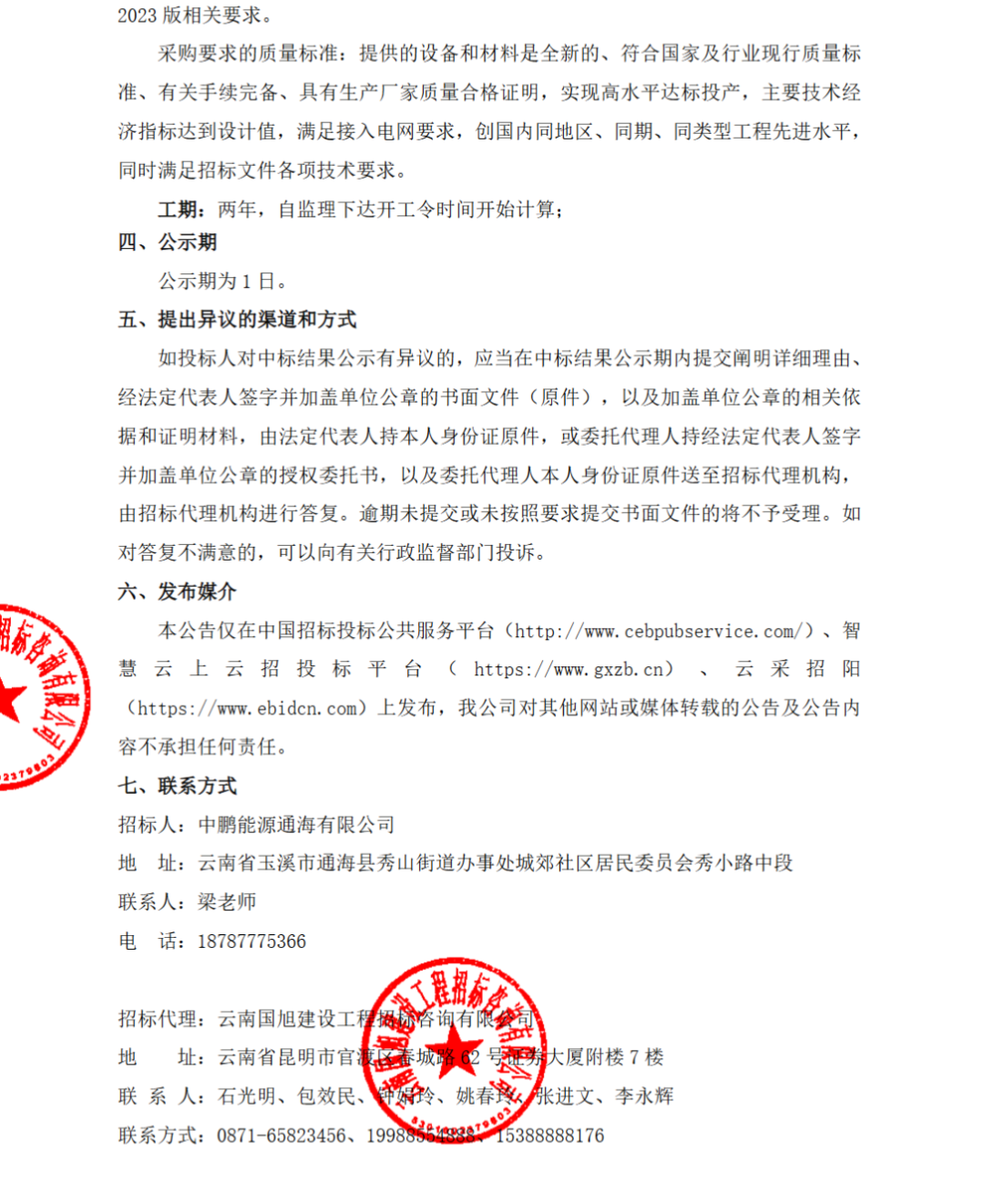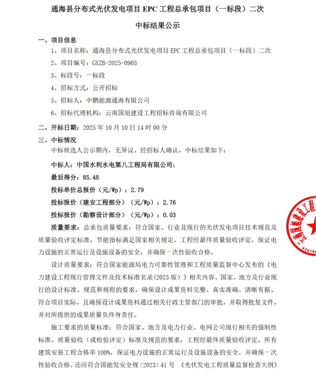 光伏头条获悉,日前,通海县分布式光伏发电项目EPC工程总承包项目(一标段)二次中标结果公告发布。