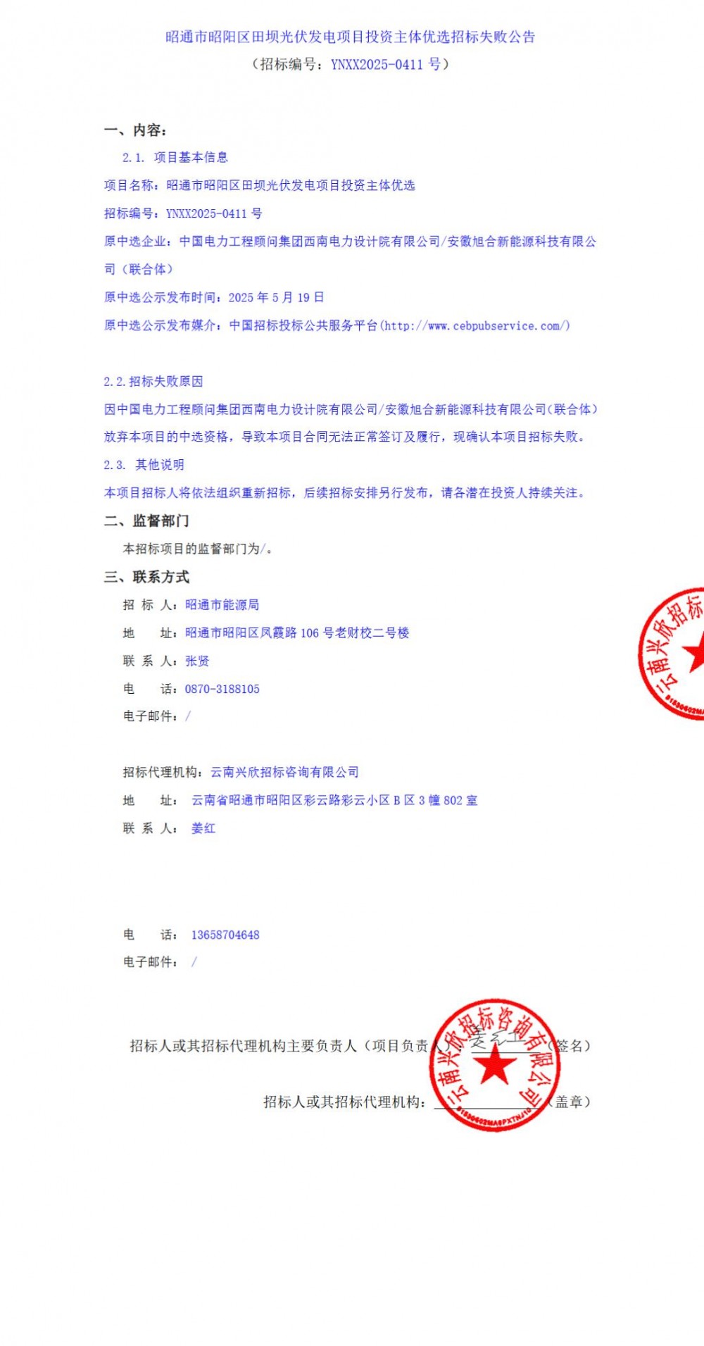 10月20日,云南昭通市昭阳区田坝光伏发电项目投资主体优选招标失败公告发布。