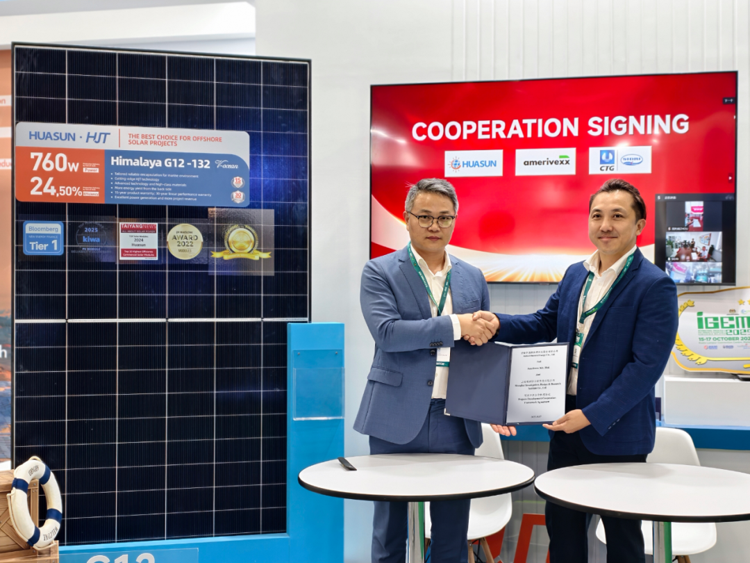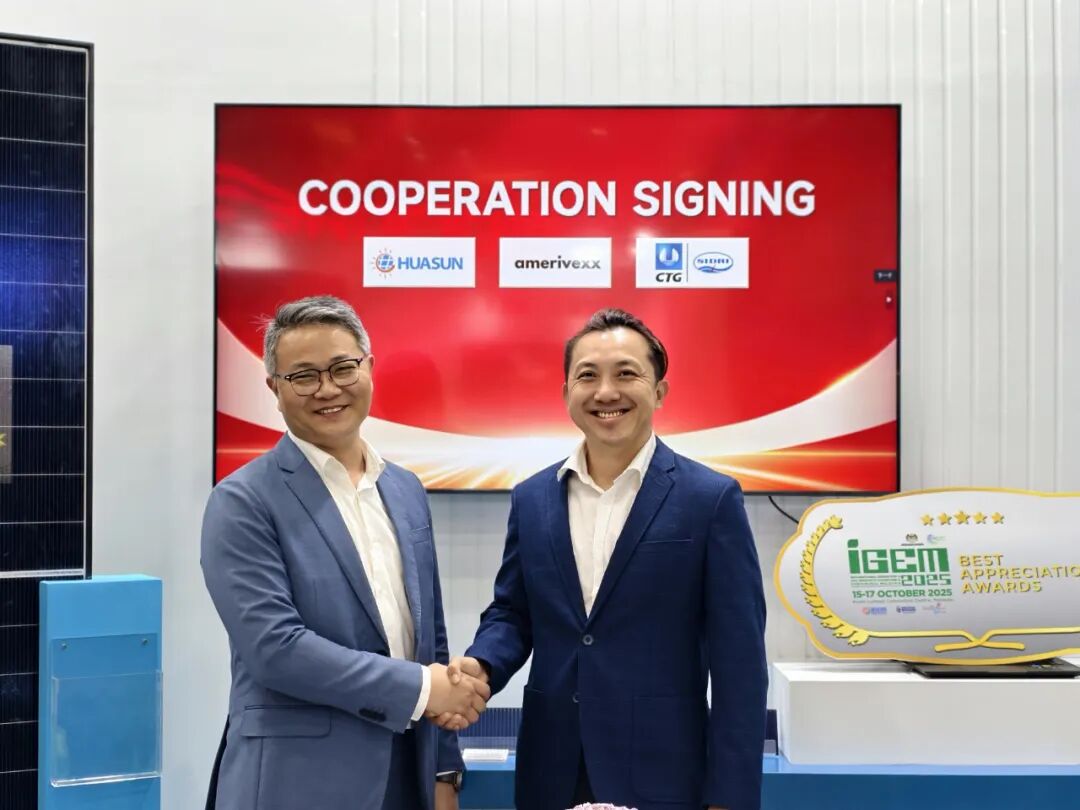 签约仪式于IGEM展会华晟新能源展台隆重举行。Amerivexx公司联合创始人DK Yeo亲临现场,与华晟新能源国际业务副总裁程学强就异质结技术路线的发展前景、全球产能布局战略及海外市场拓展等核心议题进行了深入交流。三峡上海院海外业务总经理周利峰及其团队通过线上方式同步参与。三方代表在线上线下嘉宾的共同见证下,完成了这一战略合作的签署,标志着跨国协作推动区域能源转型进入新阶段。