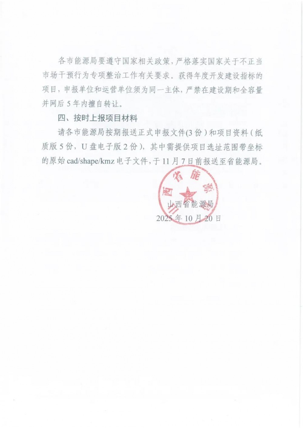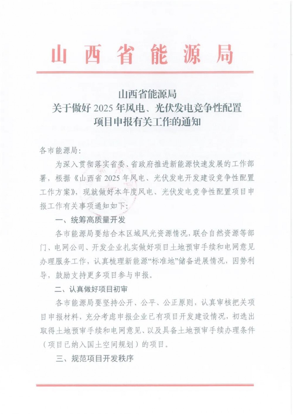 10月20日,山西省能源局印发《关于做好2025年风电、光伏发电竞争性配置项目申报有关工作的通知》。