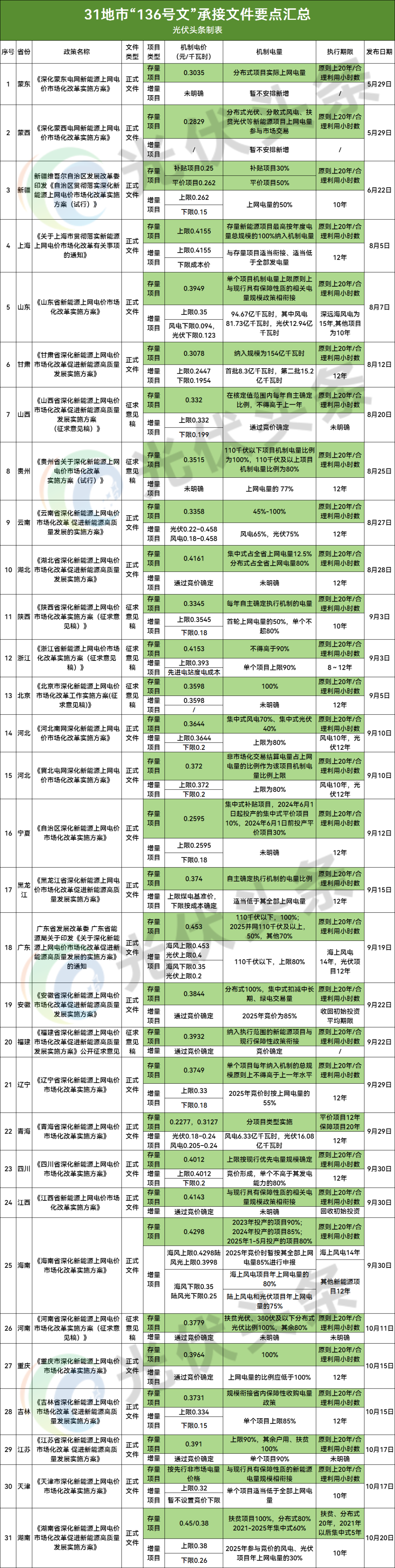 其中,4省完成首批竞价,6省市正在开展首批机制电价竞价,22省市下发正式文件,7省市“136号文”实施细则征求意见,仅西藏、广西未发布细则。