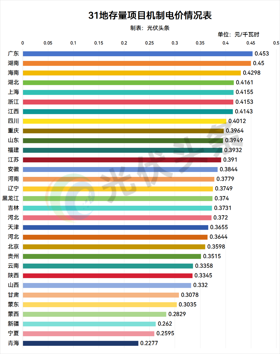 存量项目电价范围0.2277元/千瓦时-0.453元/千瓦时,广东、湖南、海南存量上网电价最高,青海、宁夏、新疆存量上网电价最低。