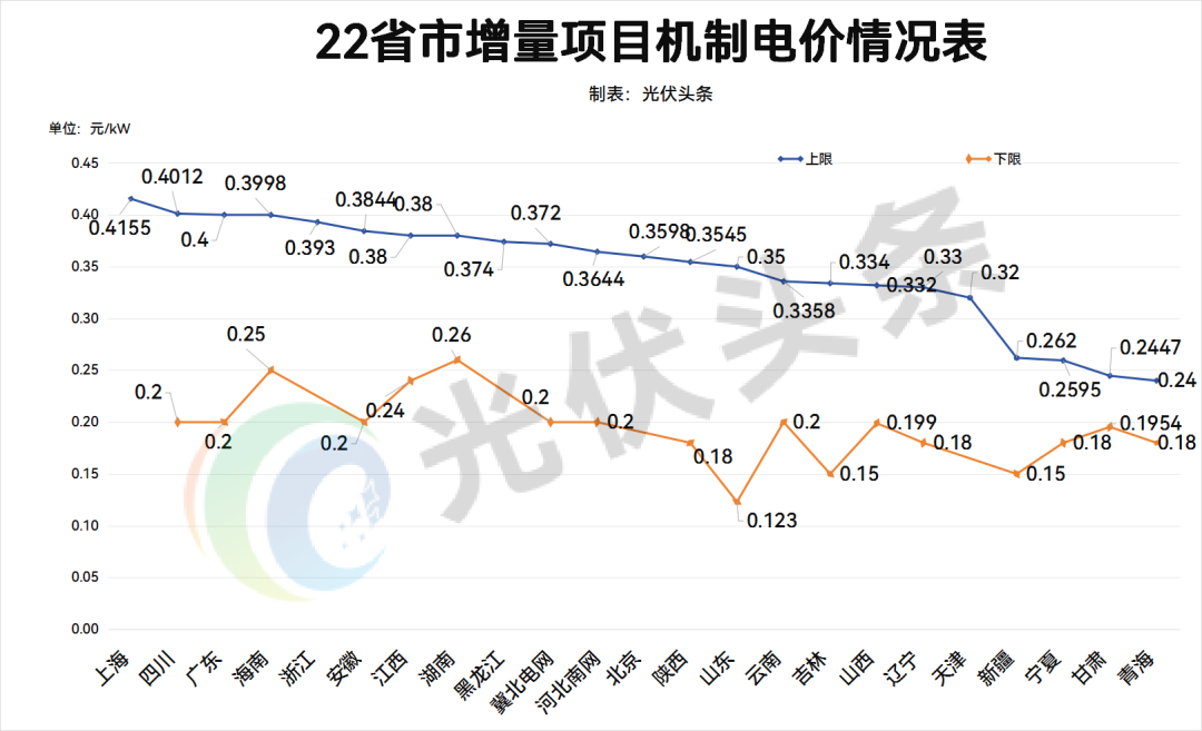 增量项目电价最高0.4207元/千瓦时,最低则不设下限!广东、上海、四川增量项目竞价上网电价上限最高,天津、山东、吉林、新疆下限最低最低。
