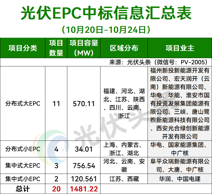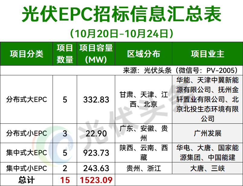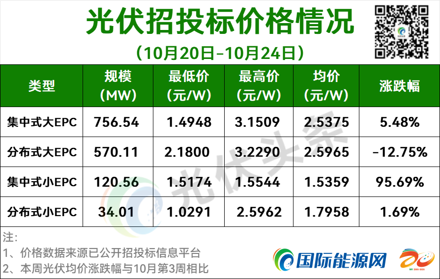 光伏头条根据10月20日至10月24日光伏EPC市场情况,精选展示最高价以及最低价项目。