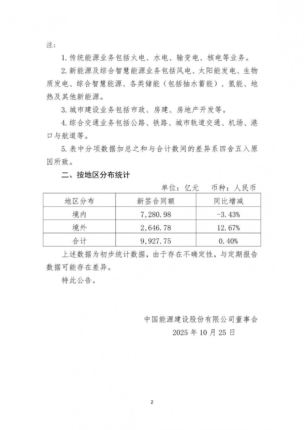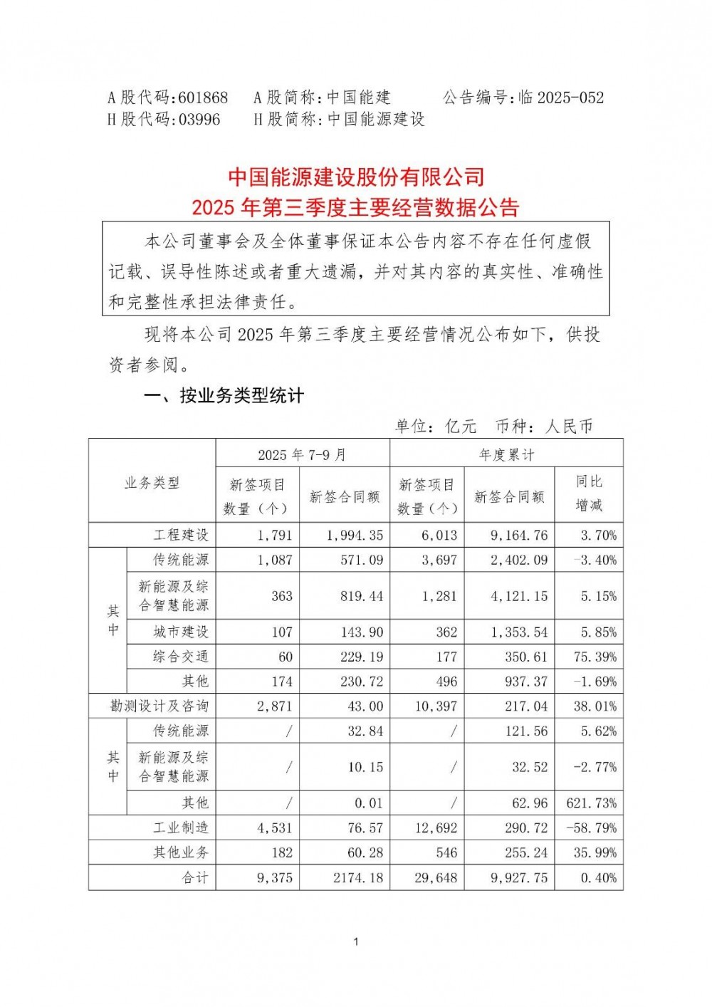 10月24日晚间,中国能源建设股份有限公司发布2025年第三季度主要经营数据公告。公告表示,2025年1-9月,公司新签合同额9927.75亿元,同比增长0.4%,达到万亿级别。