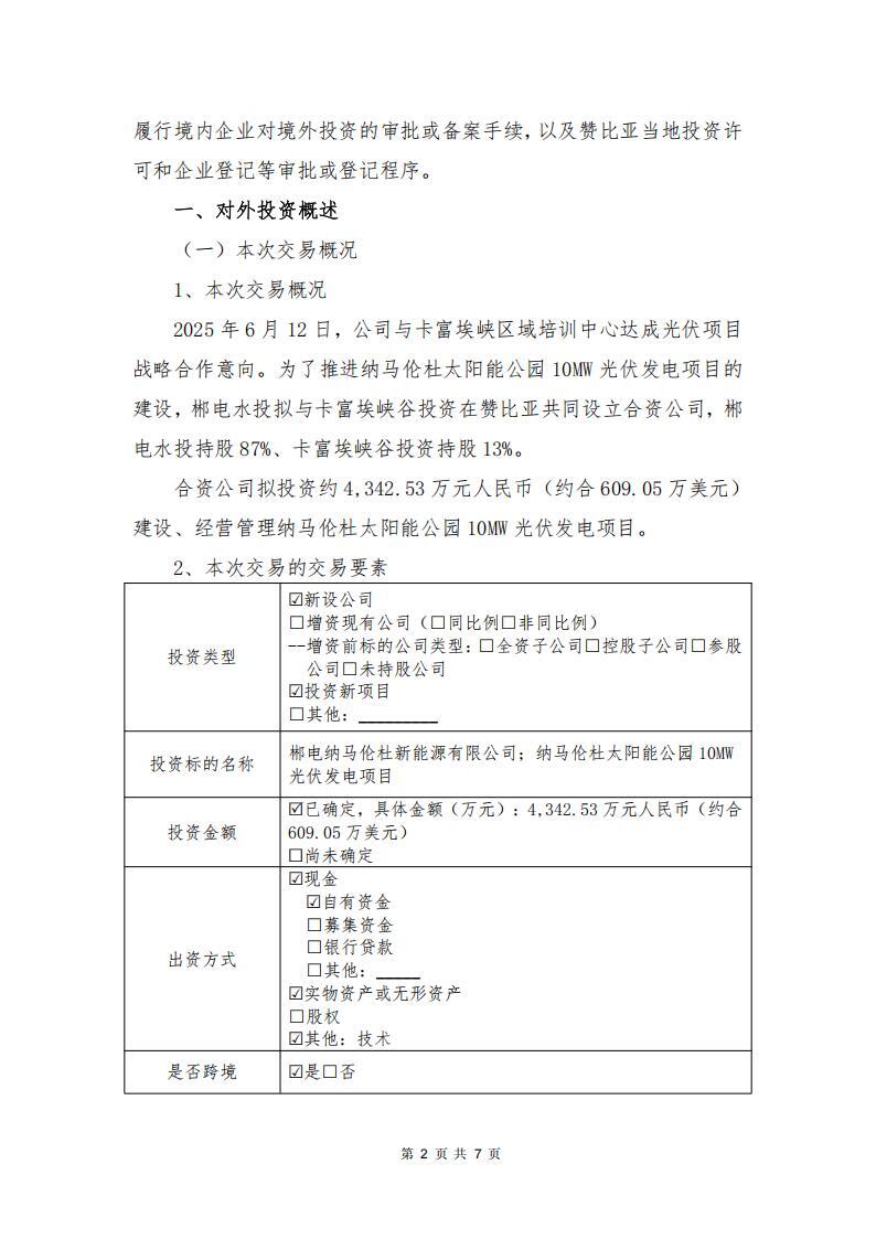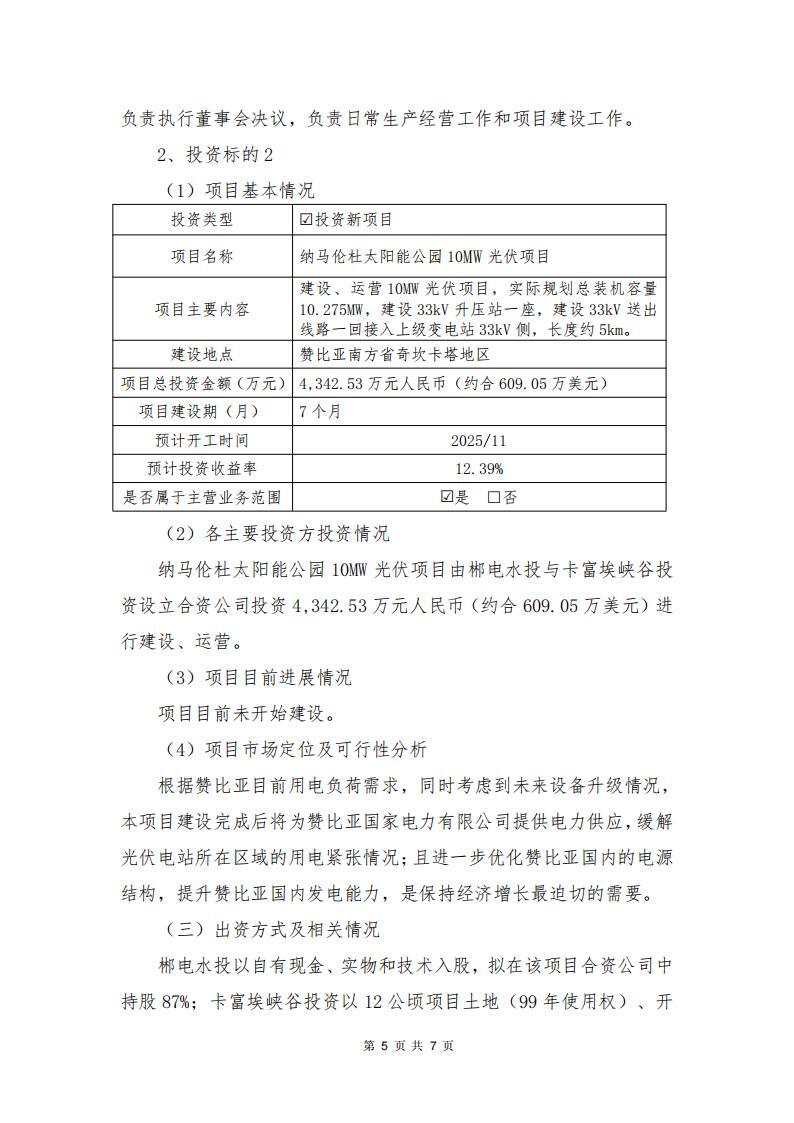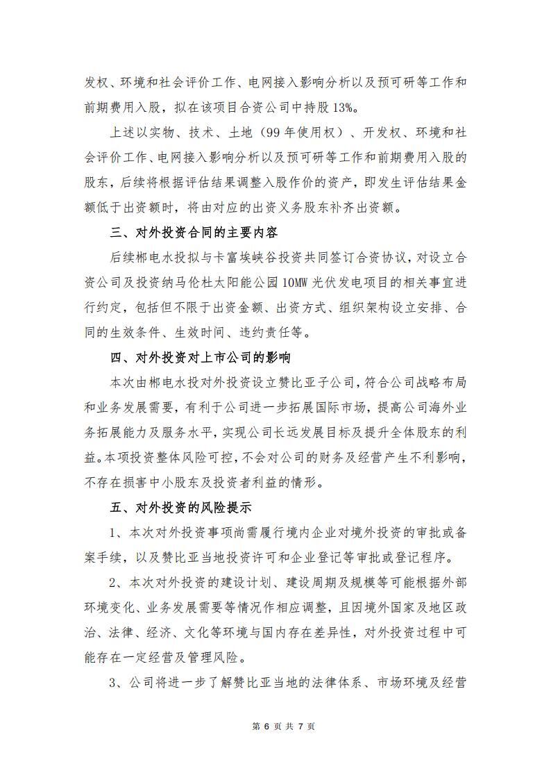 合资公司拟在赞比亚南方省奇坎卡塔地区投资约4342.53万元人民币(约合609.05万美元)建设、经营管理纳马伦杜太阳能公园10MW光伏发电项目。