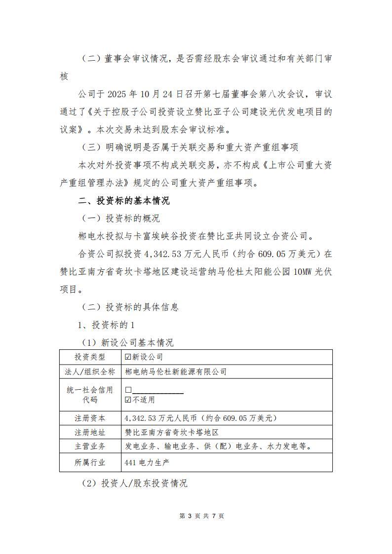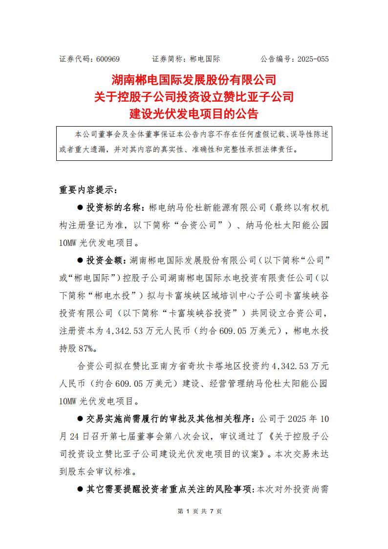 10月27日,郴电国际发布关于控股子公司投资设立赞比亚子公司建设光伏发电项目的公告。