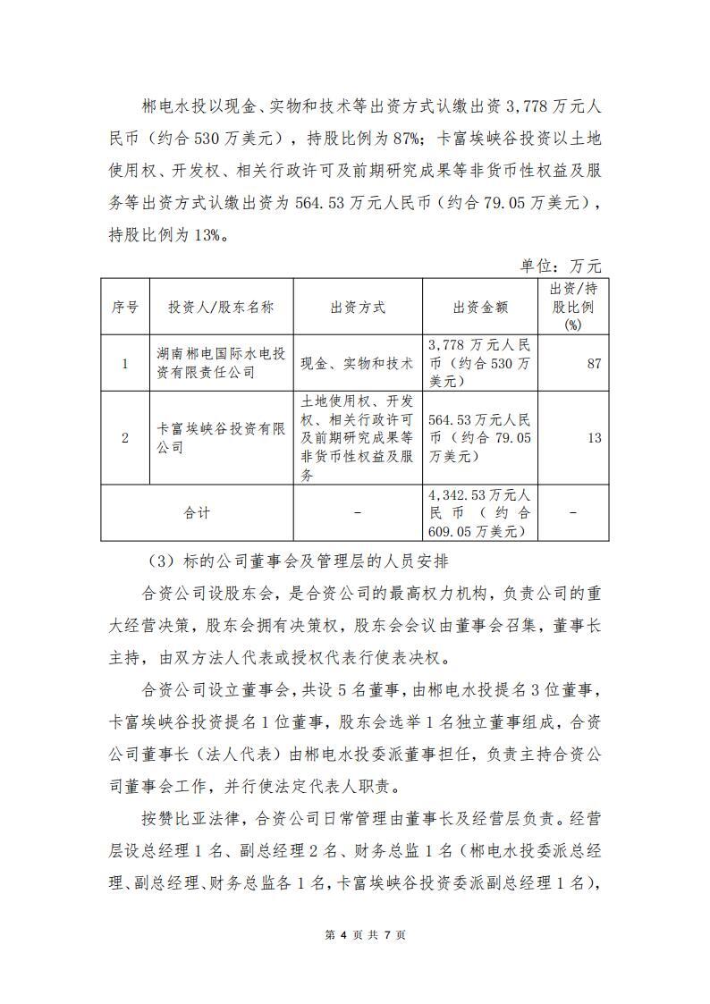 公告显示,郴电国际控股子公司湖南郴电国际水电投资有限责任公司拟与卡富埃峡区域培训中心子公司卡富埃峡谷投资有限公司共同设立合资公司,注册资本为4342.53万元人民币(约合609.05万美元),郴电水投持股87%。