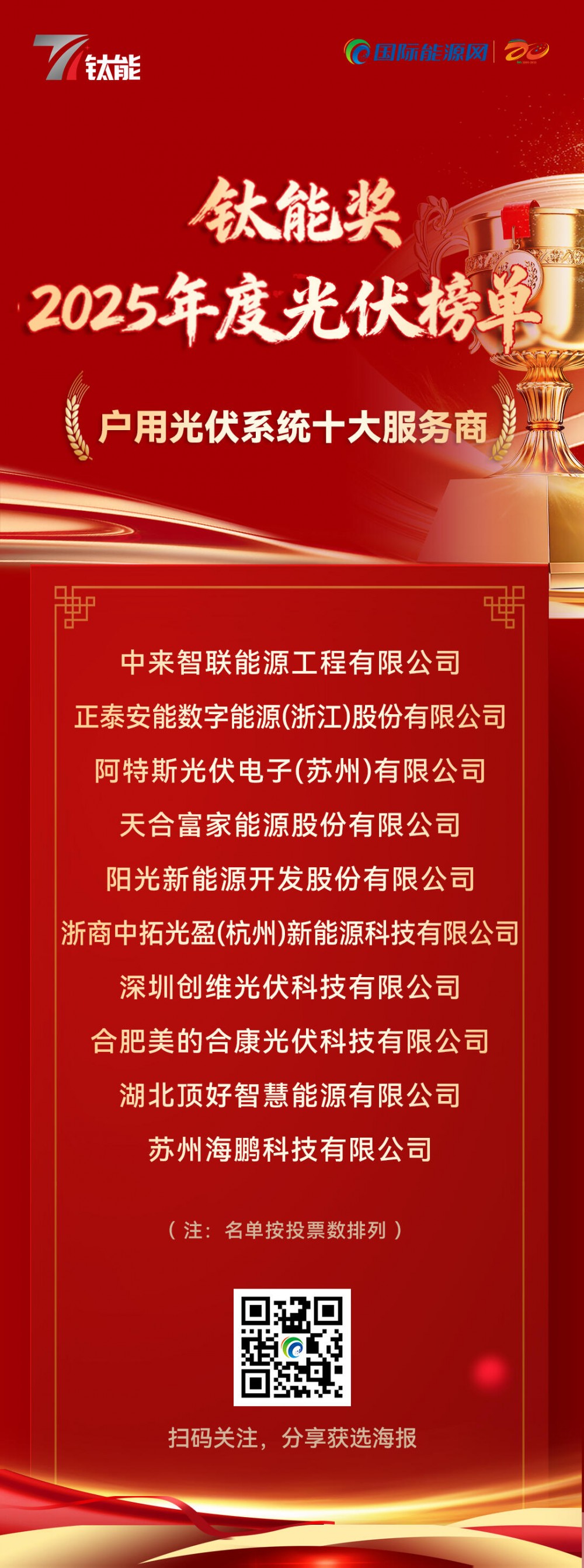 10月11日,“钛能奖 · 2025年度光伏颁奖典礼(GPBC10th)”成功举办,钛能奖·2025年度:户用光伏系统十大服务商揭晓!