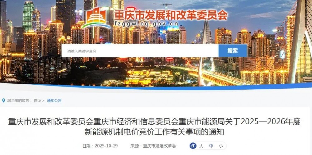 光伏头条获悉,10月29日,重庆市发展和改革委员会、重庆市经济和信息委员会、重庆市能源局发布《关于2025—2026年度新能源机制电价竞价工作有关事项的通知》。
