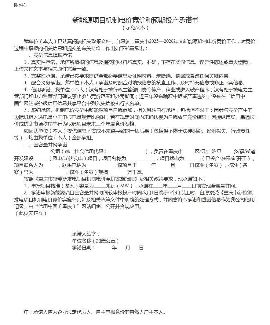 附件:1.新能源项目机制电价竞价和预期投产承诺书(示范文本)