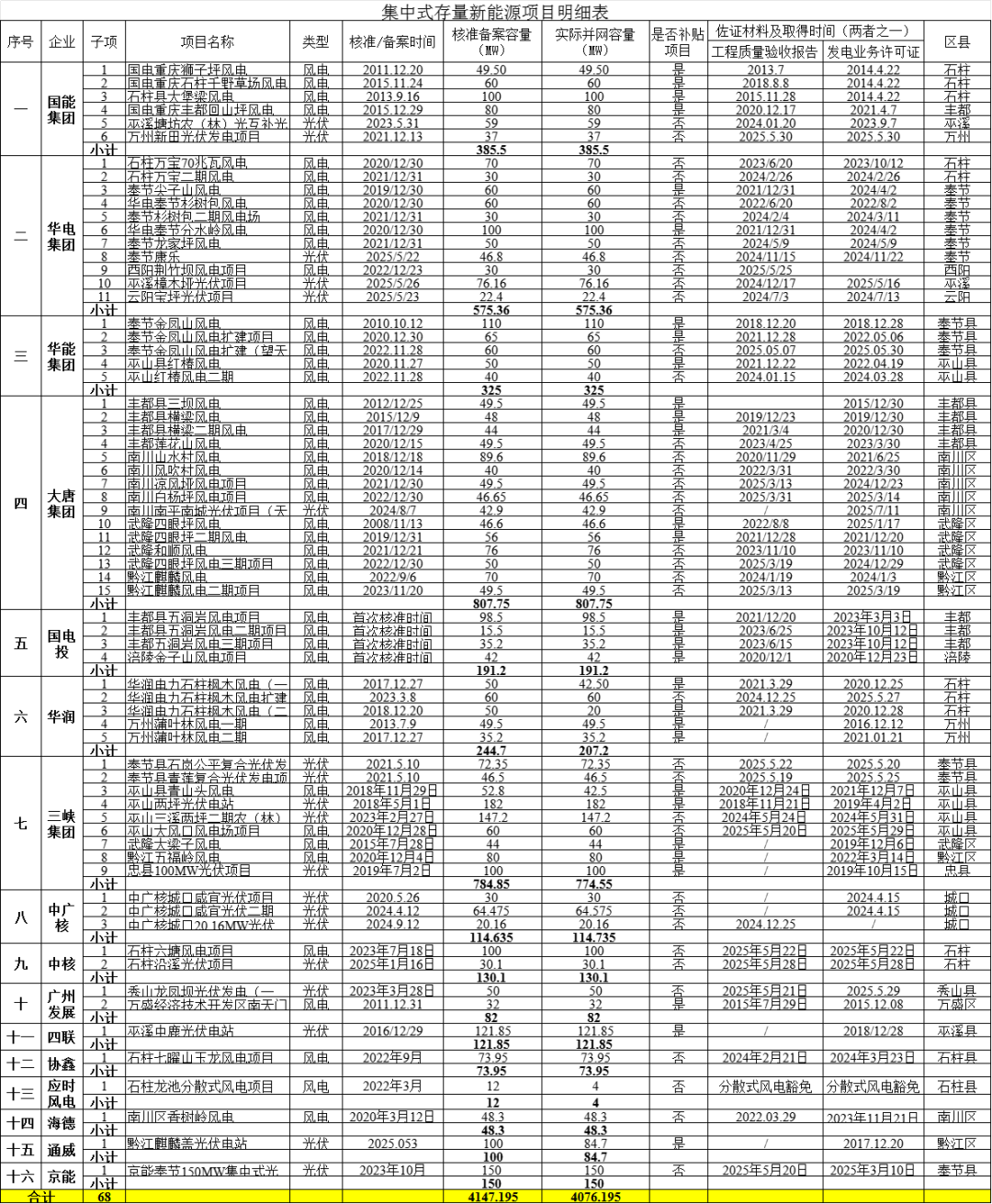 根据清单来看,项目总计容量7.45GW,其中集中式项目共计68个,实际并网容量总计4076.195MW。包括:风电项目49个,实际并网容量合计2692.5MW;光伏项目19个,实际并网容量合计1383.695MW。